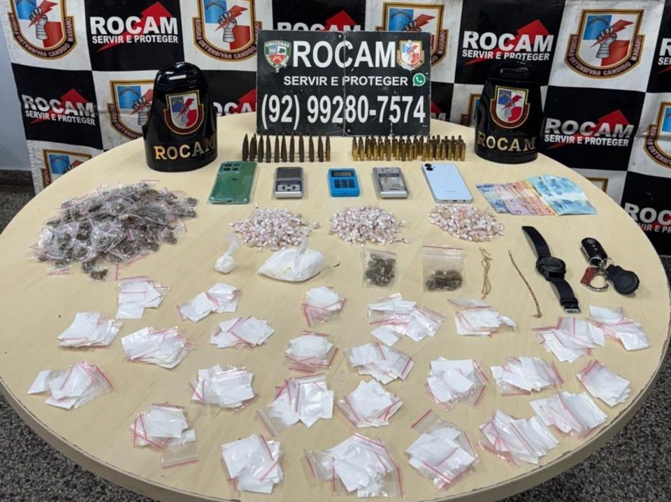 Manaus – Uma operação coordenada pela ROCAM na noite desta terça-feira (17) revelou o nível de audácia do crime organizado no bairro Compensa II, Zona Oeste de Manaus. O que começou com a denúncia de um vídeo chocante — onde um infrator disparava um fuzil calibre $5.56$ em plena via pública — terminou em uma grande apreensão de munições de guerra, drogas e a prisão de três envolvidos em uma estrutura de apoio ao tráfico.