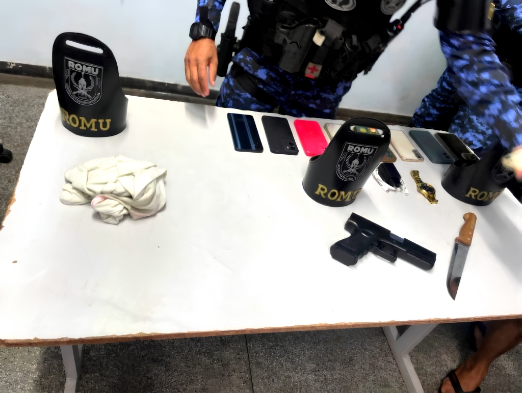 A rápida intervenção da Ronda Ostensiva Municipal (Romu) resultou na prisão de três homens que aterrorizaram passageiros da linha 560 na noite desta segunda-feira. O crime ocorreu na avenida Margarita, nas proximidades do Jardim Botânico (Musa), logo após o coletivo deixar o Terminal 4. De acordo com o relatório da ocorrência, os suspeitos utilizaram uma faca e um simulacro de arma de fogo para render as vítimas dentro do veículo lotado. Por esse motivo, os agentes que patrulhavam a área perceberam a movimentação estranha e decidiram agir para interromper a ação delituosa. Por consequência do cerco policial, todos os envolvidos foram detidos, apesar da tentativa inicial de fuga de parte do grupo.